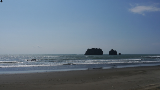 親子岩ふれ愛ビーチは国道336号線の様似付近にある海水浴場。無料の駐車場が整備され周辺からのアクセスは容易。この海岸付近から沖合に大小の3つの岩が寄り添うように並んでおり、まるで3人家族の親子のよう。青い海に並ぶ親子岩の景色の絶景にしばし見とれていた。