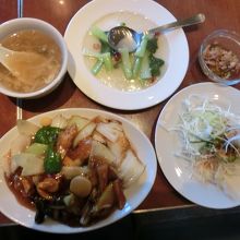 白身魚の甘酢あんかけを注文。これに青菜の炒め物、棒々鶏いりのキャベツサラダ、肉の佃煮風小鉢にスープがついてくる。