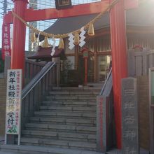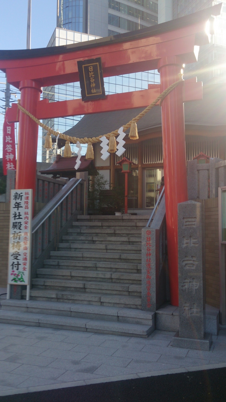ずっと工事が続いていた新橋駅前の環状第二号線の開通に伴い、新橋4丁目から現在地に移り、新たに造営されました。新たに開通した道路は公募で新虎通りと名付けられ、その東端にあたります。豊受大神など五つの祭神がまつられています。鯖稲荷とも称されています。