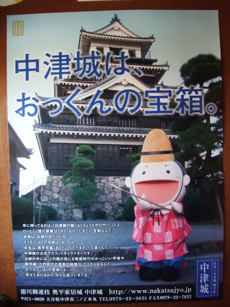 現在の中津城本丸は、後に藩主となった奥平家により、昭和39年に再建されたものだそうで、中は「奥平家歴史資料館」となっています。中津城では公式マスコットキャラクターの「おっくん」のポスターが出迎えてくれました。「おっくん」は家康公のひ孫の奥平忠昌公がモデルだそうです。