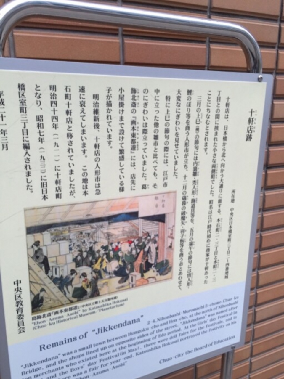 日本橋から10分位歩いたところにあり、昔は五月の端午の節句に甲人形や鯉幟を売る仮店が十軒あったことから、十軒店の名があるといわれているようです。ただ、1700年代後半には41軒にもお店が広がったようです…