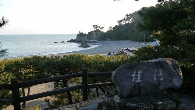 高知県にとどまらず全国的にも有名な海岸である桂浜。岬の間に展開する海岸線がゆるやかな曲線を描いており、その形状が美しい。遊歩道が整備されているので、ゆっくりと曲線美を眺めながら散策を楽しんだ。美しい砂浜であるが、危険なため遊泳禁止の看板が掲げられていた。