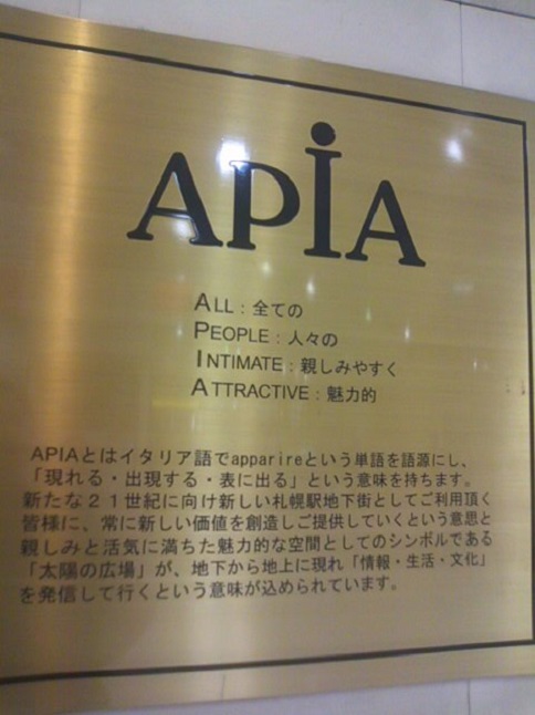 札幌駅地下街の中でも、パセオやエスタと比較すると新しいのがこちらのアピアですが、名前の語源はイタリア語から、そして英語の頭文字を取った二重の意味が込められていることは意外と知られていないように感じます。アピアのほぼ中央、太陽の広場には語源に関するプレートが設置されていますので、是非探してみて下さい。