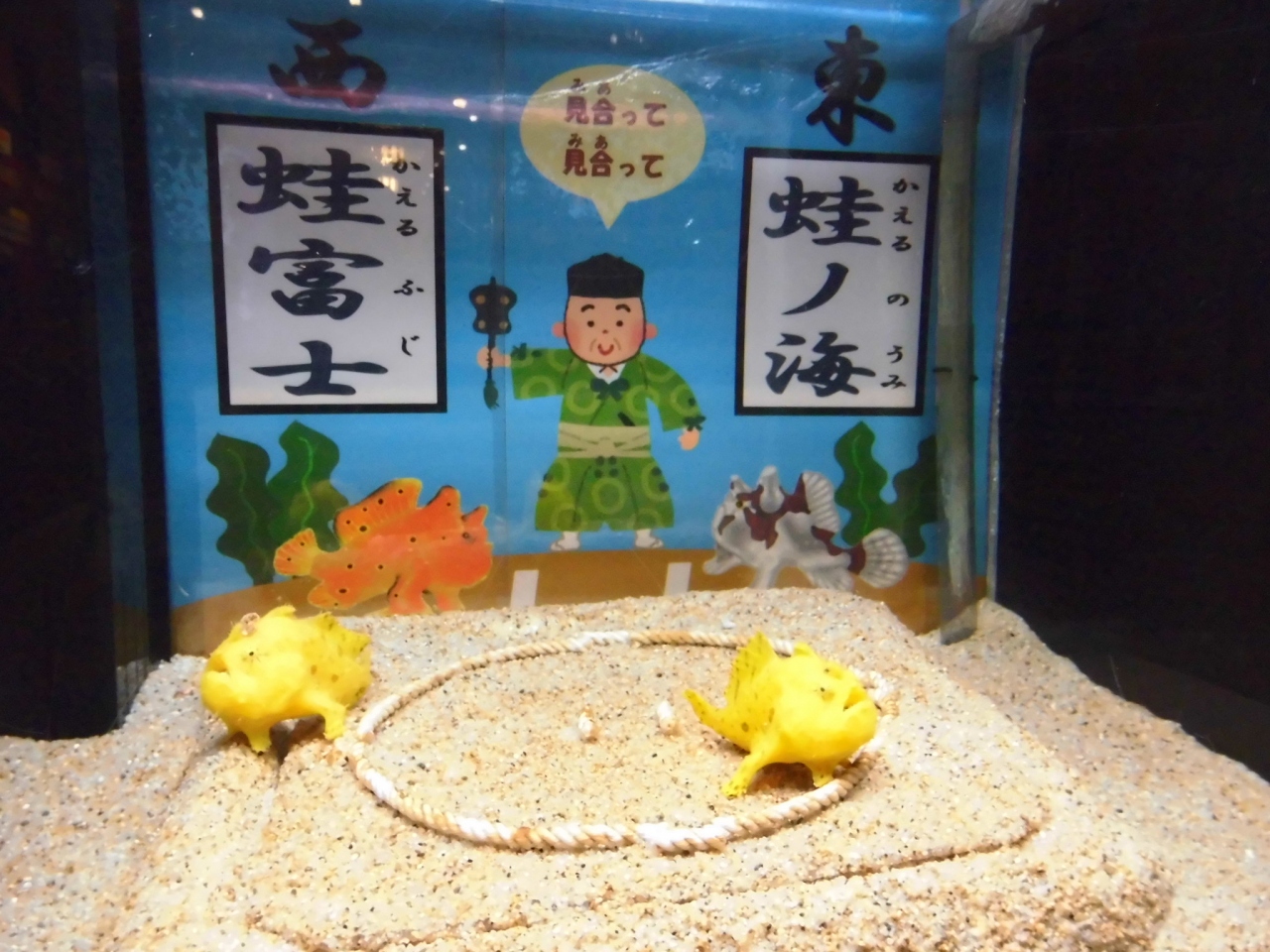 お魚自体は取り立てて珍しいものはいないのですが、展示の仕方が「お魚合コン」とか「寿司ネタ」とか、くすっと笑ってしまうような、ギャグ満載でよしもとらしかったです。