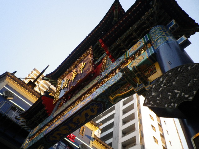 通称東門。山下公園方面から中華街へアプローチする場合は、この門をくぐることになります。守護神は青龍。それにちなんで門柱は鮮やかなブルーとなっています。日の出を迎える門です。この門をくぐって朝粥を食べに行くのもオツなものです。