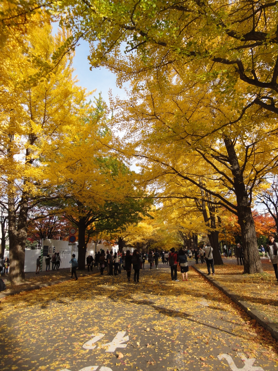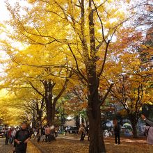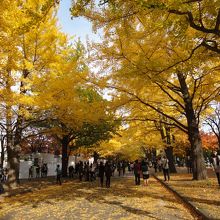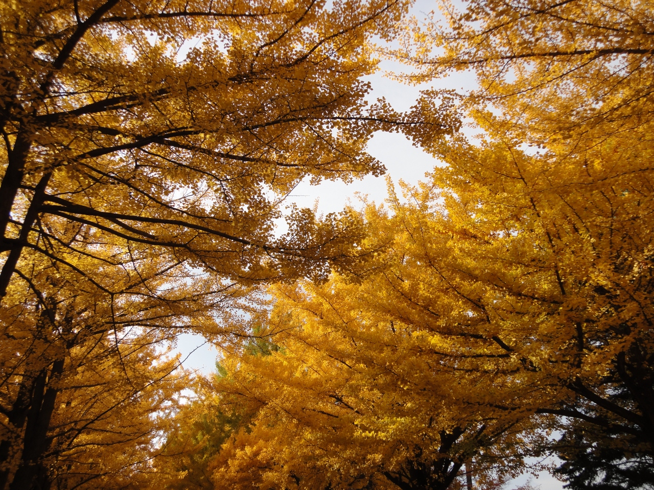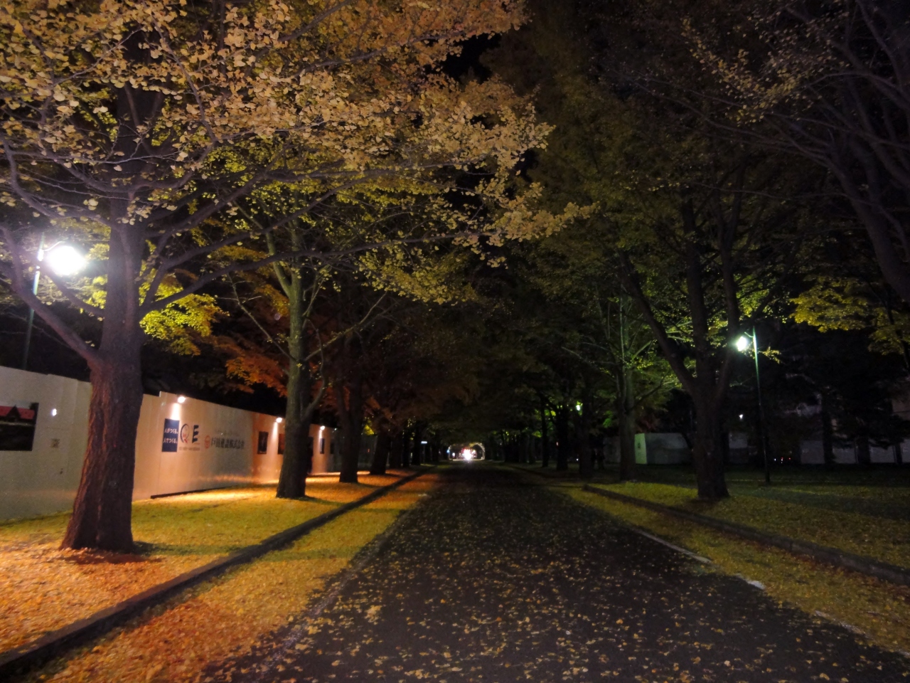 今年は10月下旬ごろが見頃だったので、昼と夜、2度北大キャンパスに足を運びイチョウ並木を散策してきました。土日の日中は人が多く混雑していましたが、夜になると人通り少なく、わずかながらライトが灯っているので昼間とはまた違った風景を感じることができました。