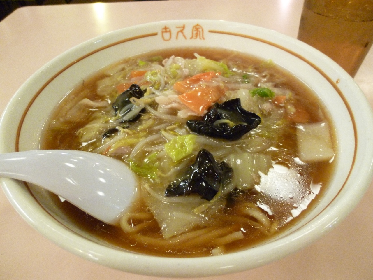 サンマーメンとは横浜から静岡くらいまでのエリアで食べられているラーメンで、古久家さんのはスープは甘めのしょう油ベース、麺は太めのストレート、そしてモヤシや白菜、ブタ肉、きくらげの入ったアンがかかっています。