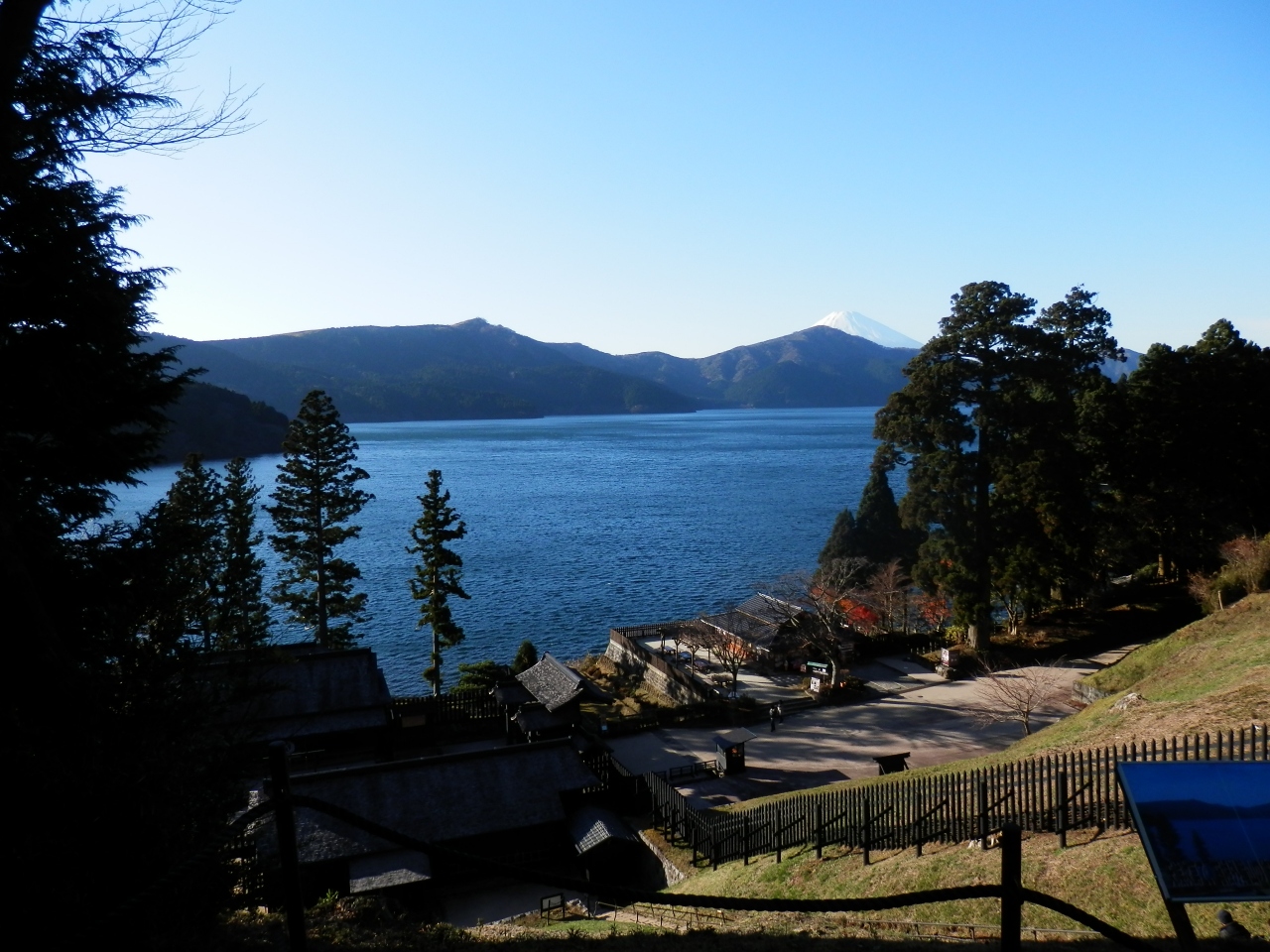 途中で小高い丘の上に登れるところがありましたが、70段くらいの階段をヒーヒー言いながら登ると、当時の見張り台?がありそれと一緒に芦ノ湖が一望できました。