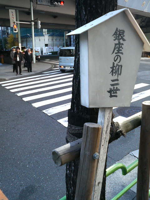(白い立て札に「銀座の柳二世」とあり、師走の冷たい風に柳の葉が吹き流されていました)