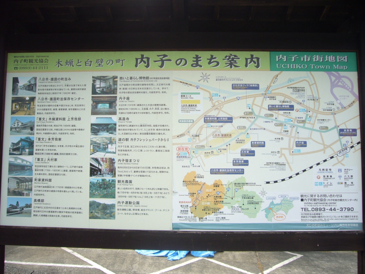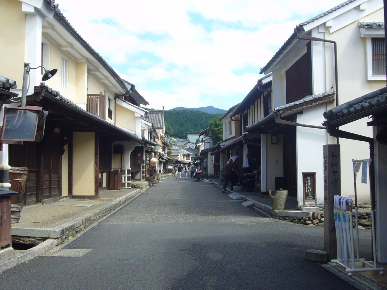 古き良き白壁の和風の建物が立ち並ぶ地域です。駐車場も完備されていて、そこには分かりやすい市街地図と観光案内の載った看板がありました。街並みには静かな時間が流れています。