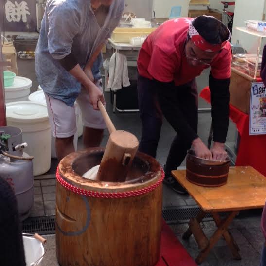 12月になると十条銀座はクリスマス、年末年始の行事のための「催しもの店」がさまざまなものを売ります。今回は早々と「もちつき」をパフォーマンスして、つきたてのお餅の団子を売っていました。商店街の通りが人でいっぱいになり通行するのが大変でした。