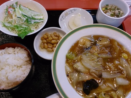 八宝菜、スープ、御飯、サラダ、小鉢の5品です。