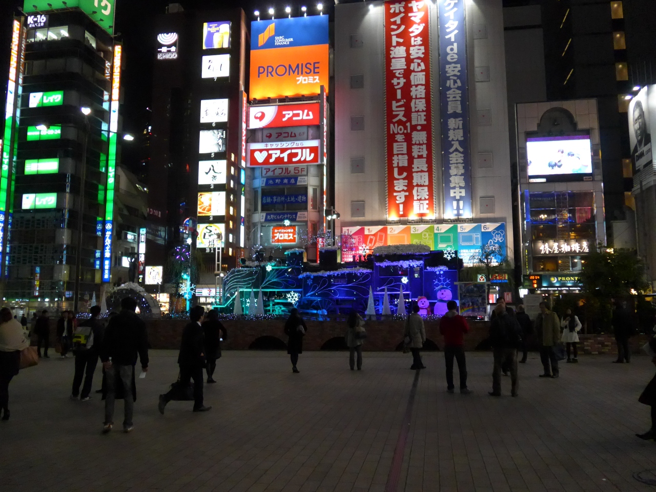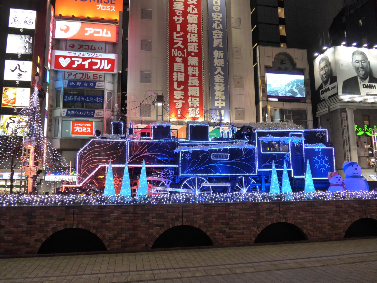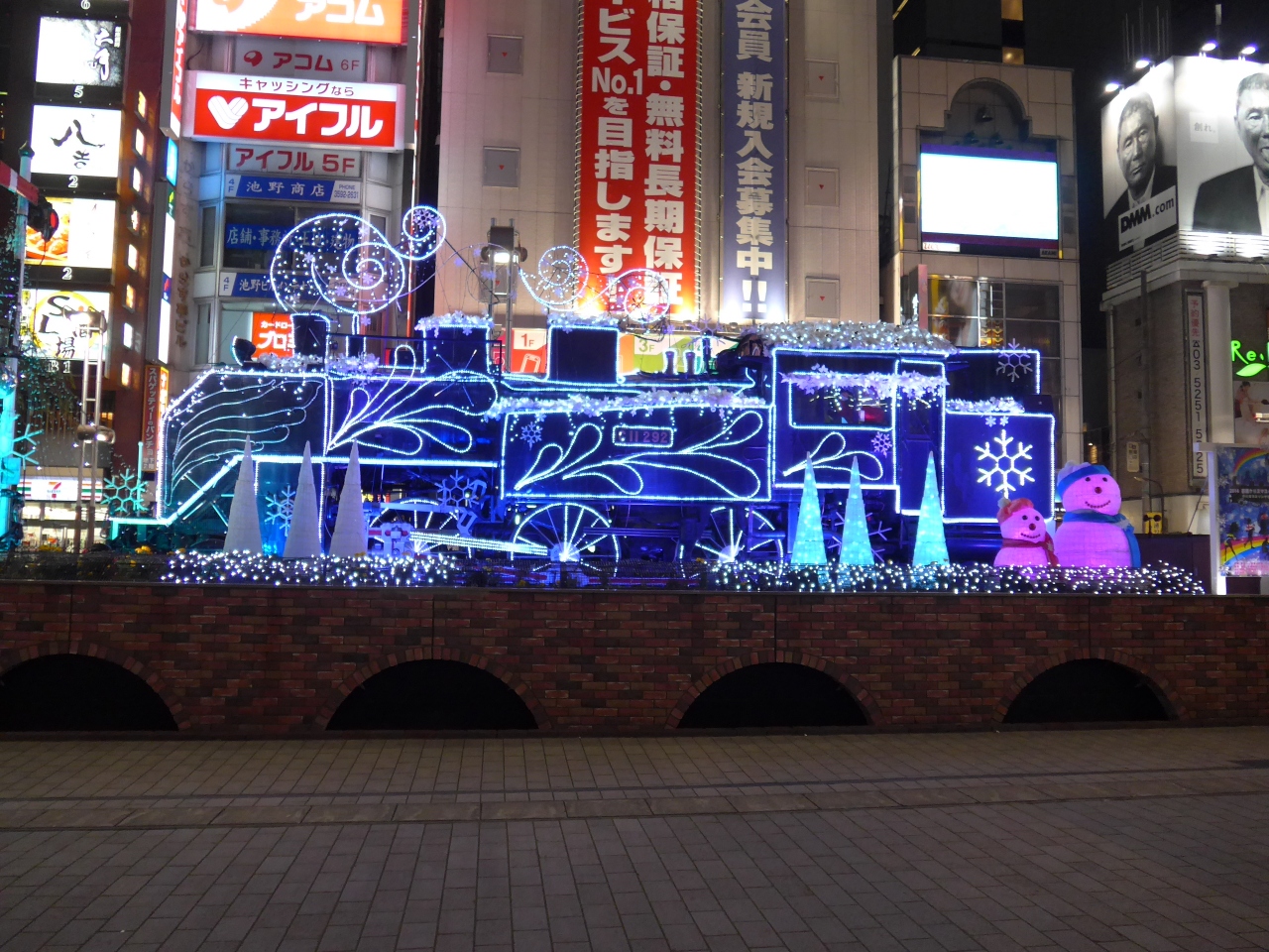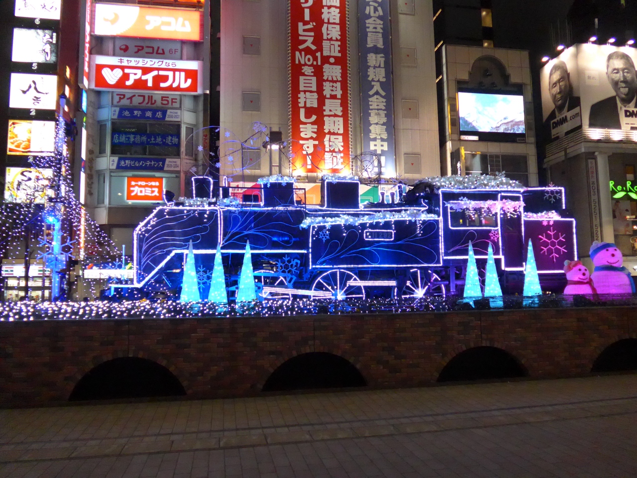 新橋駅周辺はSL広場の蒸気機関車はたくさんのLEDランプで演出され