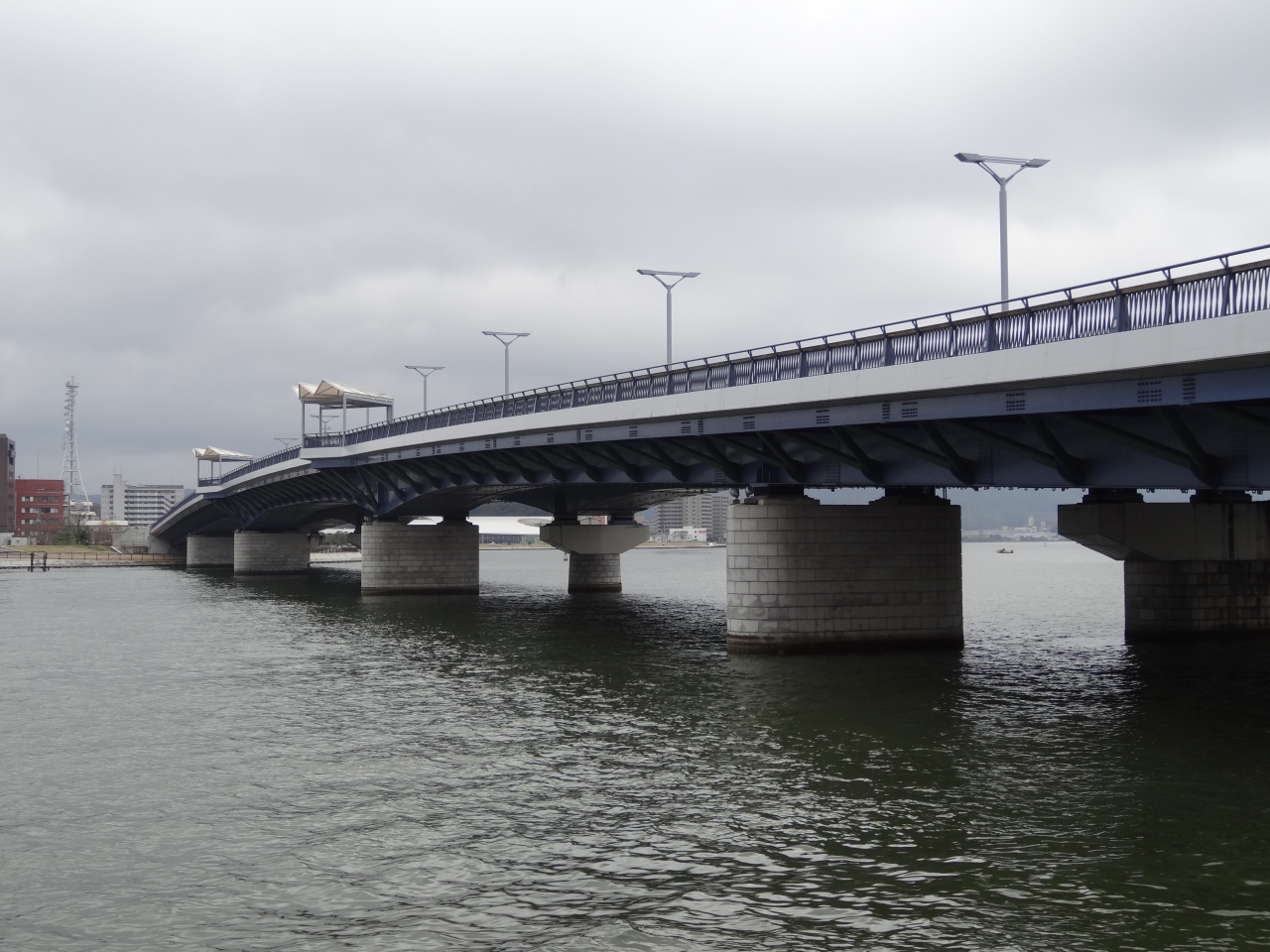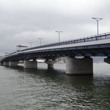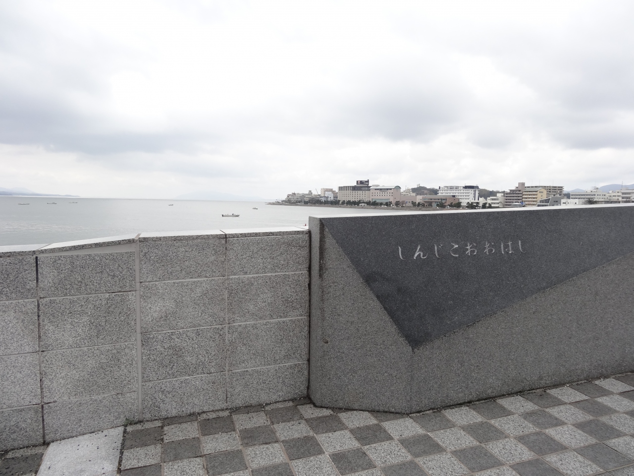 宍道湖にかかる宍道湖大橋。島根県道37号松江鹿島美保関線の一部であり、かつては有料(50円)だった橋です。橋の上から眺める宍道湖はなかなかのもので絶景スポットとなっています。私は歩いて渡りましたが、ほとんど徒歩で渡る人はいないですね。車の通行量は結構あります。
