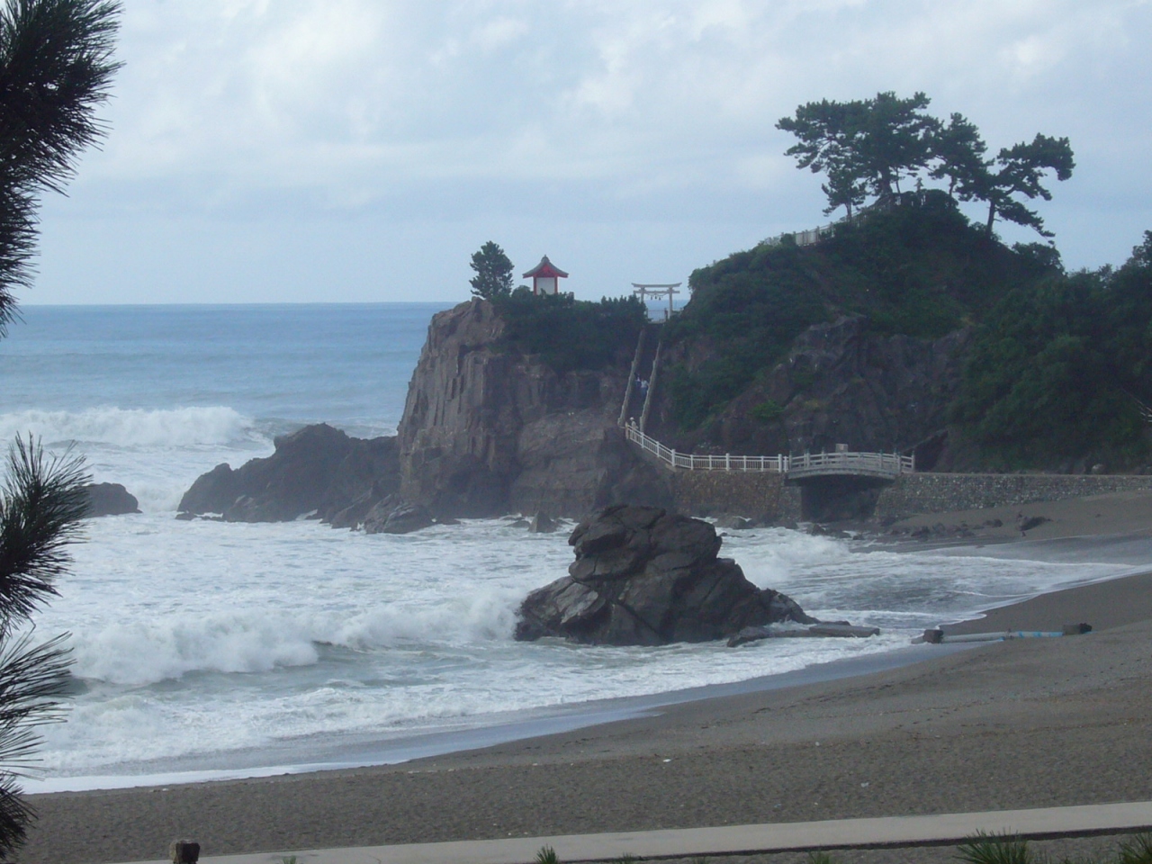 太平洋を望む有名な浜です。松の並木と砂浜、奥に見える岩と崖、そして荒波と、浮世絵にありそうな風景を味わえます。なお世間一般の浜とは違い、相当波が荒いので、波打ち際に近寄るのは厳禁とのことでした。あくまでも風景を楽しむのがメインとなります。