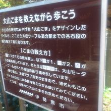 バス停から大山ケーブルまで、歩いて15分ほどの参道です。ずっと登りの階段が続くので、しんどいです。踊り場ごとに土産で有名なコマの数を示す絵が描かれています。ときどき、階段にクイズが書かれています。参道の左右には大山豆腐の料理屋やお土産屋さんが連なっています。