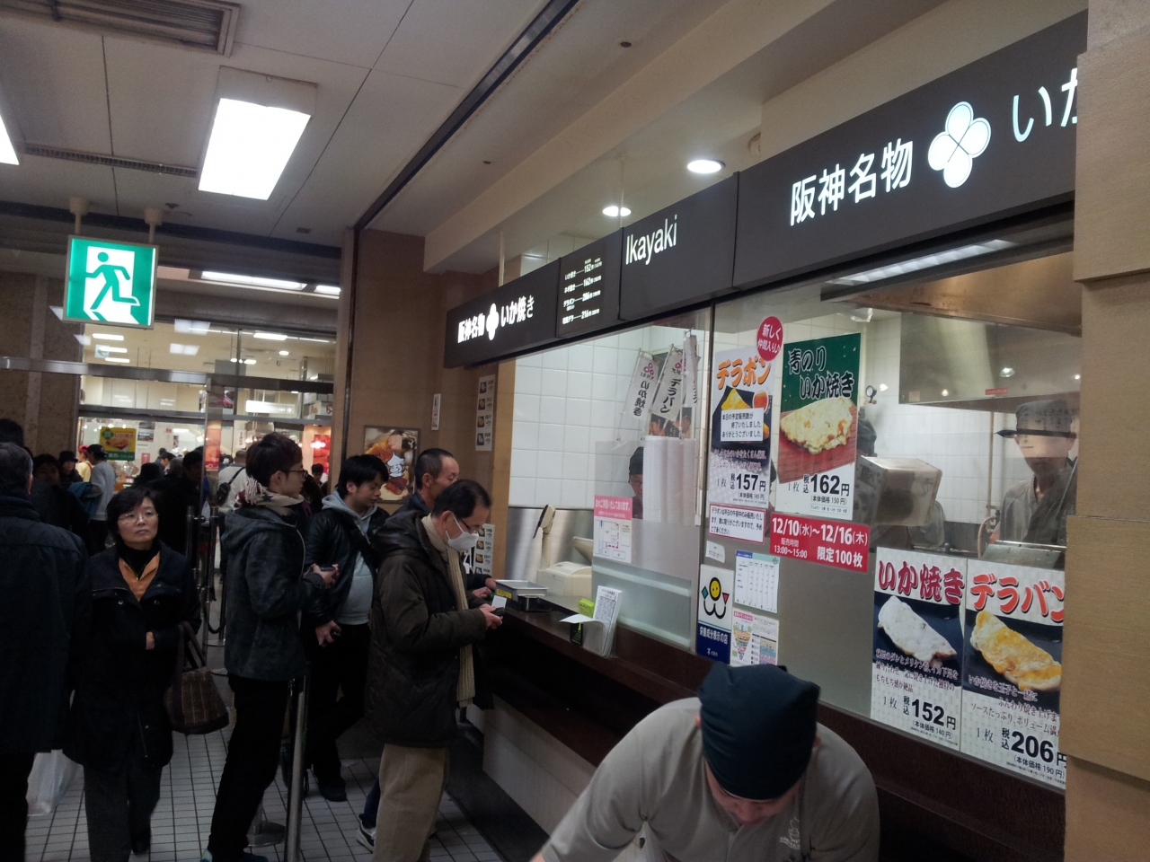 阪神百貨店の地下1階のフードコートにある名物いか焼き店。ものすごく混んでいて長蛇の列です。30人ぐらい待っていて大体10分~15分くらい待ちました。肝心のお味の方ですが、身が少なくて、ちょっとな~、といった感じ。安いのはいいんだけど。もうちょっとボリュームを増やした方がいいかも