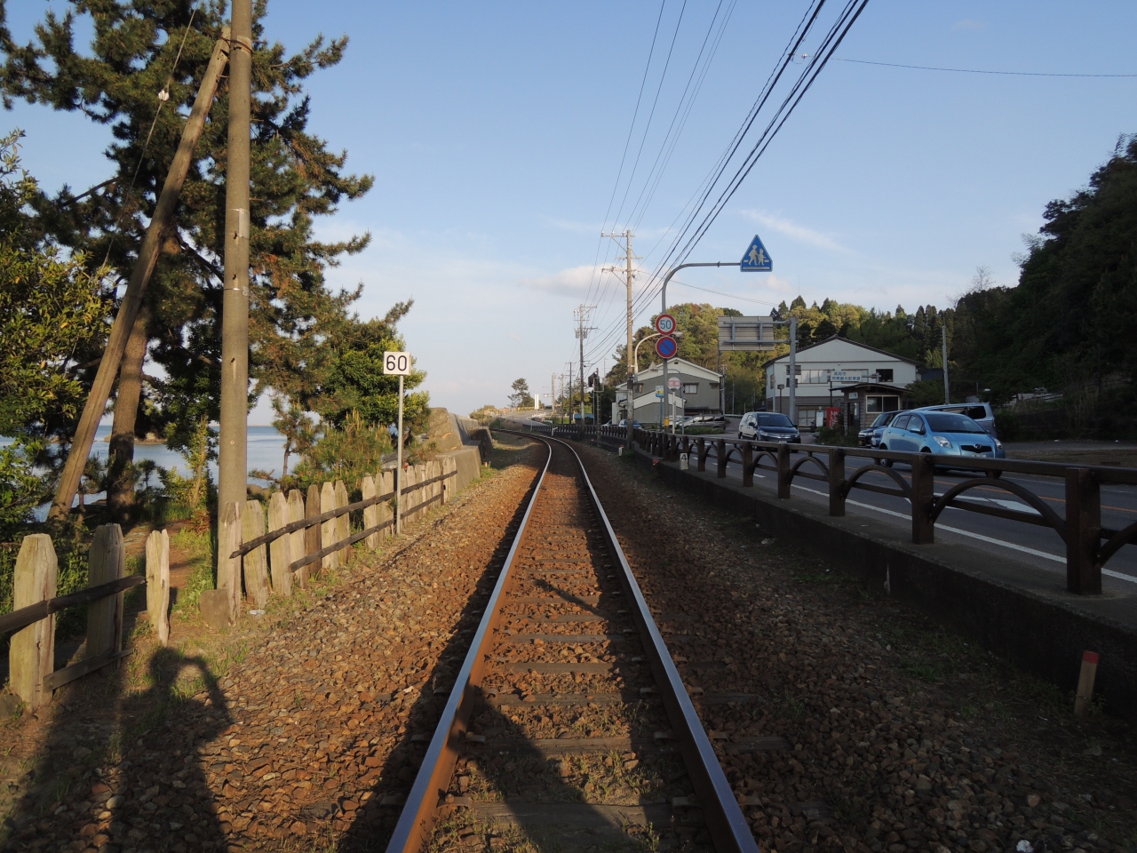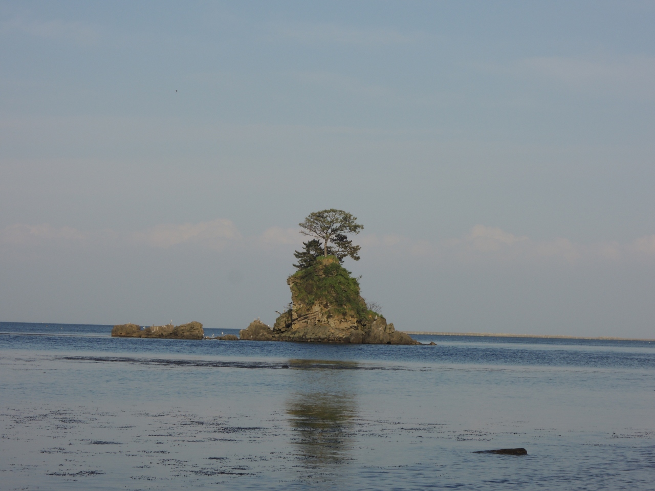 JR線路をわたって海岸に行くと、源義経一行が奥州平泉に向かう途中、雨が降り出したため弁慶が岩を持ち上げ、そこで雨宿りしたという伝説が残る義経岩があります。義経岩のすぐ上には神社もありました。海のほうを眺めると男岩、少し離れて女岩が浮かんでいます。雨木の岩礁も見たことがなかったので、素晴らしかったです。