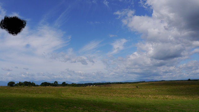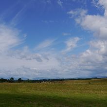 道道133号沿いにある十勝牧場の敷地内に入り、ジャリダートの道を奥まで進むと十勝牧場展望台がある。展望台まではかなりの距離を進んだが、この十勝牧場の敷地は東京都千代田区の4倍近くの広さがあるというからその広大さに驚かされる。展望台からは見渡す限りの牧場風景と奥に山々が見られ、とにかく広さを実感する景観だった。