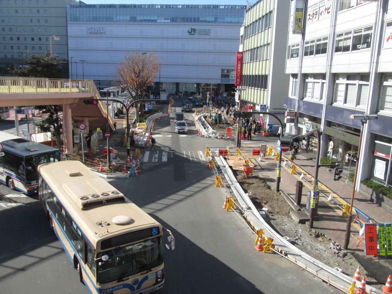 数年前に鶴見駅の駅ビルがリニューアルされましたが、今度は駅前ロータリーの道を工事しています。このため、バス停が移動されまいた。また、駅前の道路は人通りが激しいので不便です。この工事は2015年3月くらいまで続くそうです。