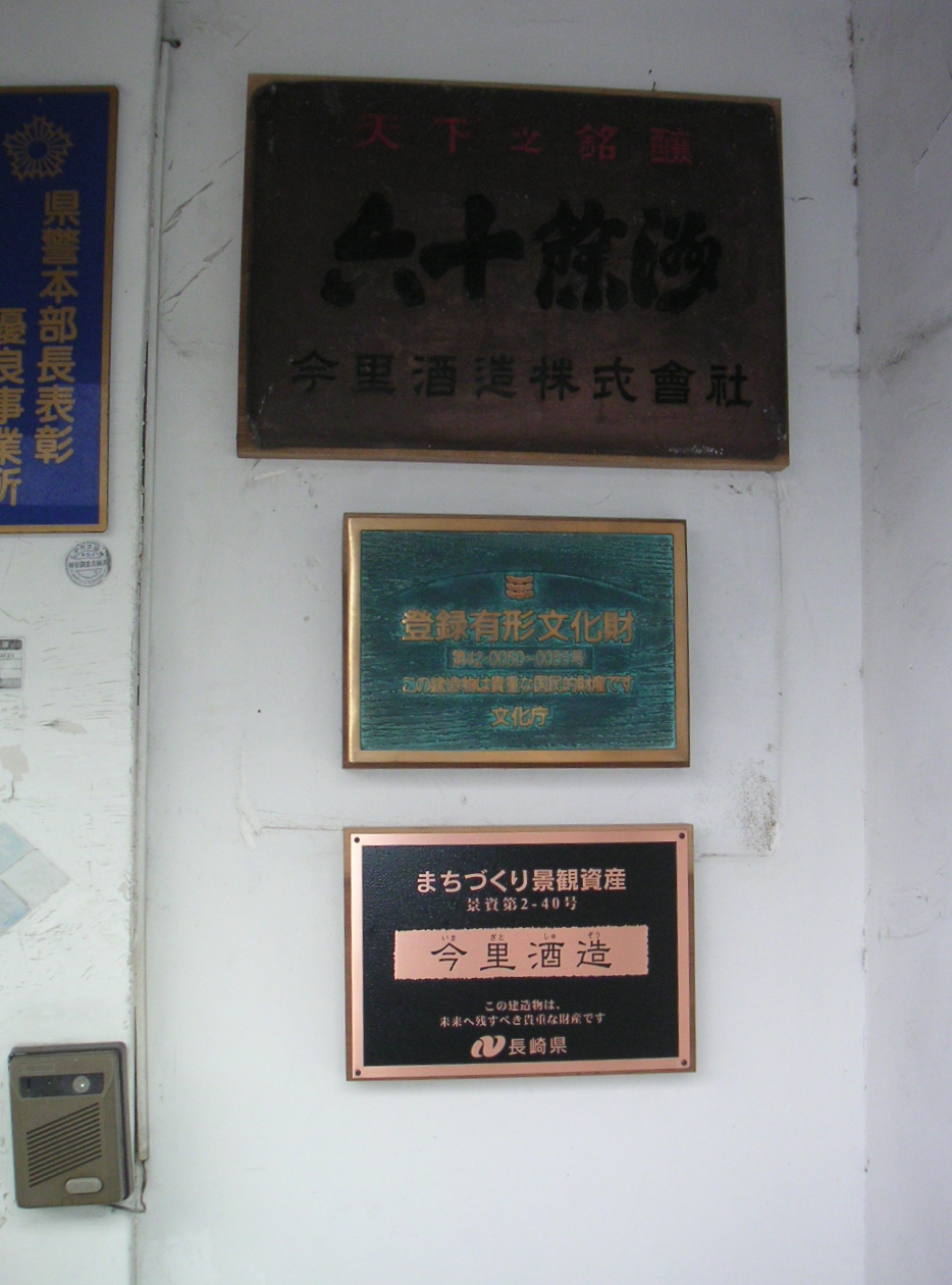 家族で波佐見町を観光した時に訪れました。今里酒造は、江戸時代後期から続く、長崎の名酒"六十餘洲"を世に送り出している造り酒屋です。十数棟からなる醸造建物群があり、その内6棟の建物が国の登録有形文化財に登録されているそうです。突然の訪問にもかかわらず、運よく見学させていただく機会を得ました。試飲コーナーもあってハンドルキーパーの私は指をくわえて見ているだけでしたが、日本酒の甘い香りに酔ったようようでした(笑)なお、父が上機嫌だったのは言うまでもありません。
