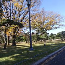 緑の芝生、玉砂利の道、多くの松の木、お濠……が醸し出す広々とした空間。