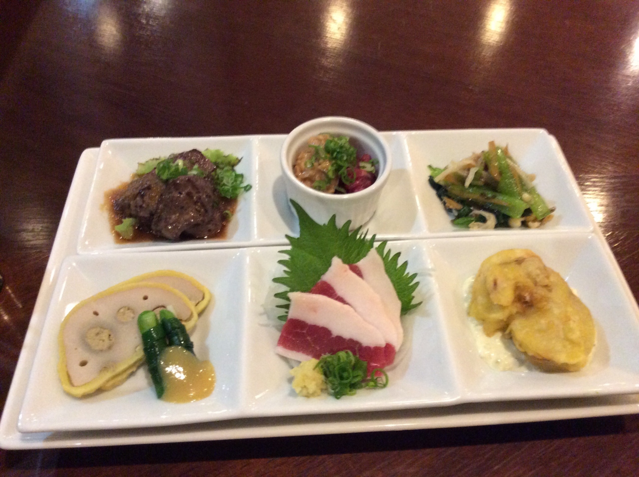 郷土料理のからし蓮根や馬刺もあるが、一口サイズに等しい量。