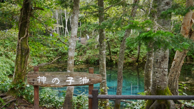 道道1115号線から神の子池の案内標識のあるところに入り、クマ出没注意の看板のあるジャリダートを進むこと約2kmで神の子池にたどり着く。池は澄んだ青色をしており非常にきれいでそこまで見える。池に沈んだ倒木がまた味わいのある景色をつくりだしていると思う。