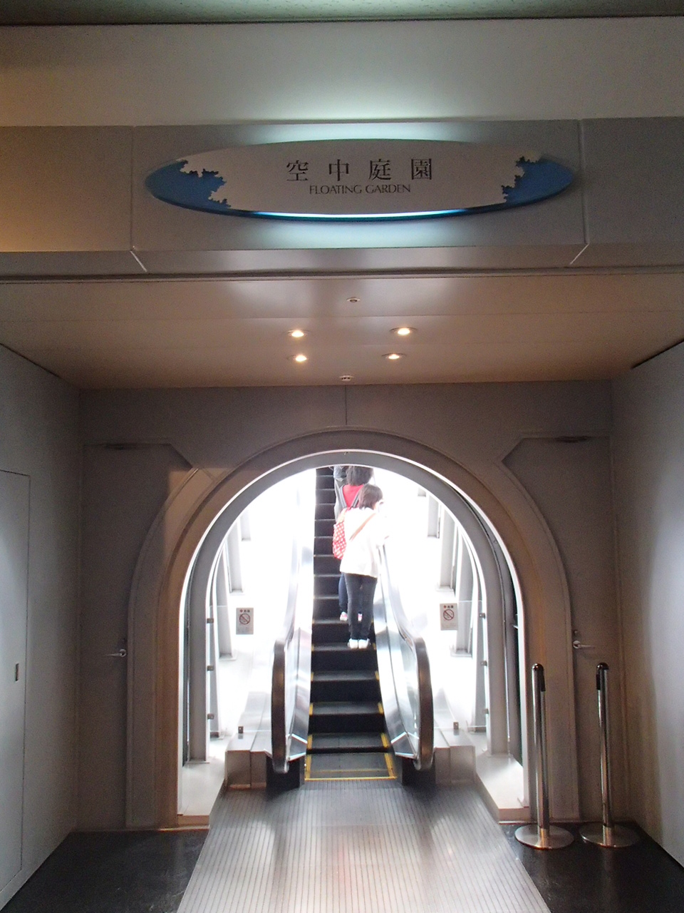 梅田スカイビル 空中庭園展望台 (うめだすかいびるくうちゅうていえんてんぼうだい)に上がる前に、長い長いエスカレータで上がります。とても高い位置に架かっているので、天に向かっている感じのする、そんな場所です。ぜひ、