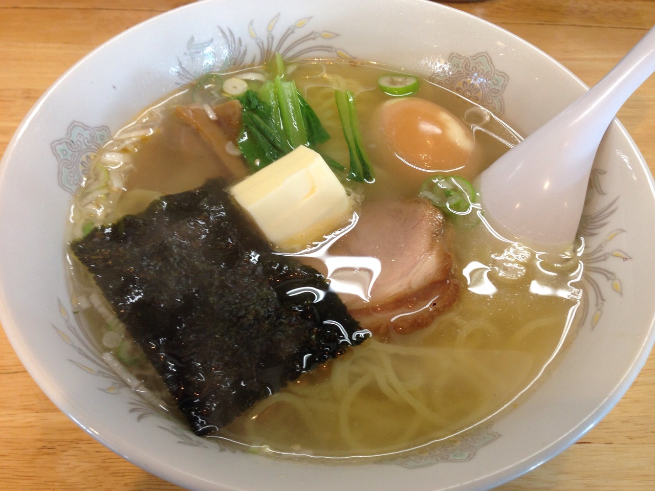 注文した煮卵塩ラーメンは塩ラーメンに醤油味の煮卵のトッピングで、バターがスープの塩気にコクと甘みを加えて飲み干せる味でした。