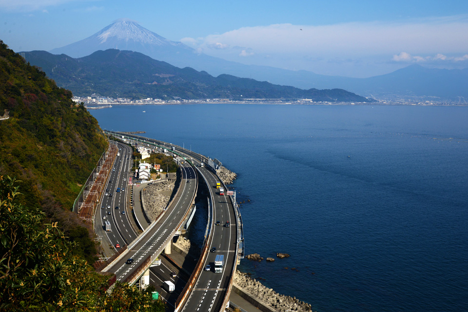 目の前には駿河湾、そしてその向こうには雄大な富士山がそそり立っています。その間を縫うように、それらとは対照的な人工物である東名高速と東海道線が走っていますが、富士山と駿河湾という雄大な景色の前には小さなもので決して邪魔にはならず、むしろこの対比が非常に面白いです。