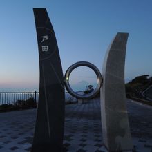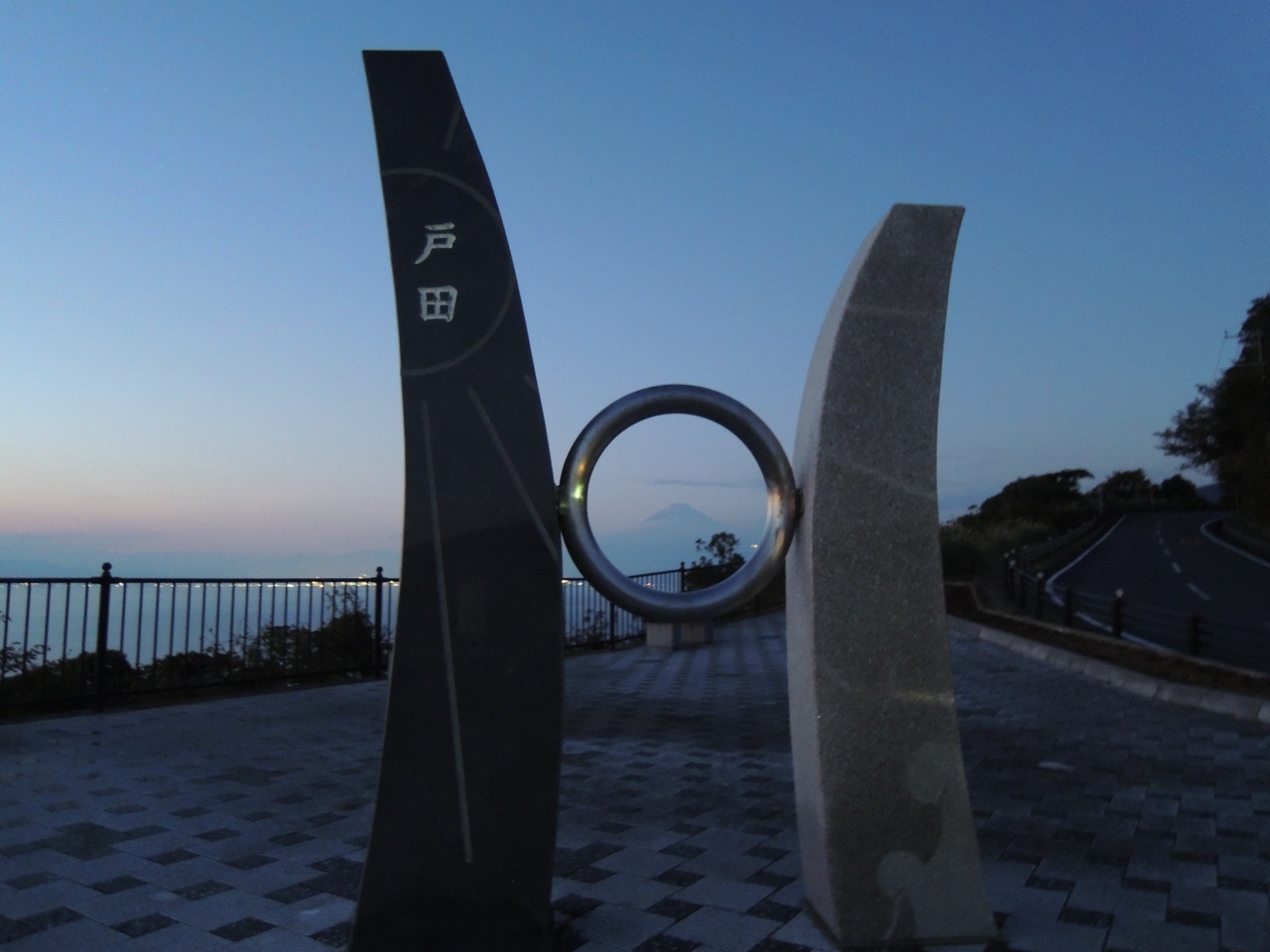出逢い岬のモニュメントの中心にリングがあり、その中に富士山が入るようにデザインされていて写真の絶好のポイントです。そして「戸田港」とそれを包みこむ御浜岬も見渡すことができます。天気がよいときには是非ドライブで寄ってみてください。冠雪の富士山の季節が最高ですよ。