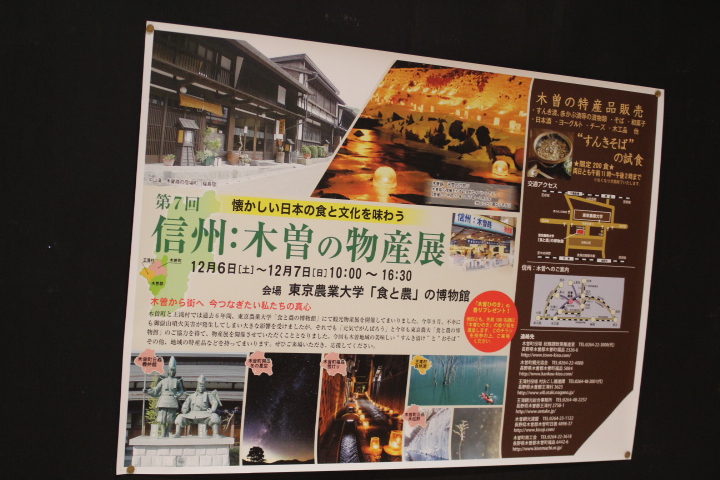 馬事公苑の正門を出たら大きな鶏のモニュメントが目に留まったので立ち寄ってみました。世田谷通りを隔てて東京農業大学のキャンパスがあり、同大学の博物館でした。翌日から開催する「信州:木曽の物産展」の準備がされていました。入場は無料です。