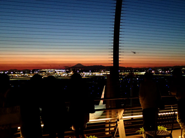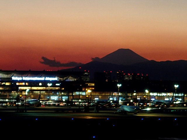 夕焼けに映える富士山のシルエットと、機体、そして国際線ターミナル。