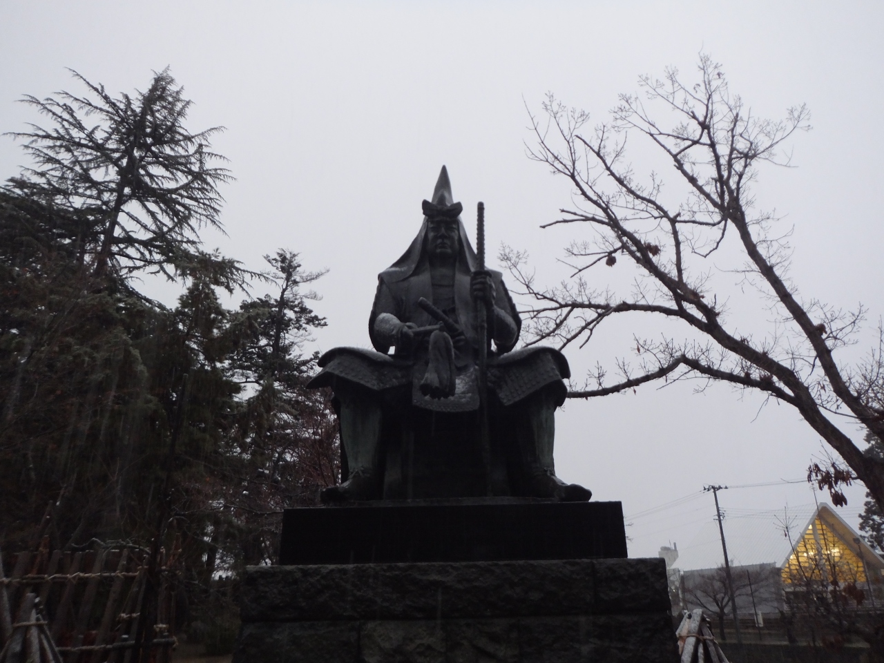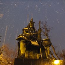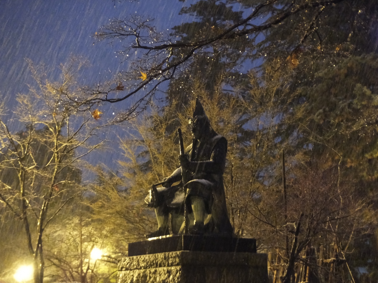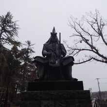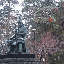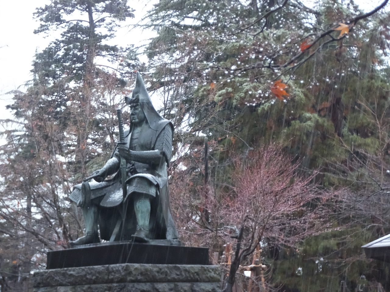 米沢城全体がそうでしょうが、桜の頃は像の付近もきれいだと思います。訪れた時は、初冬のみぞれ雪に打たれ、わびしそうに座っていました。