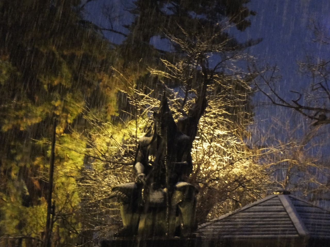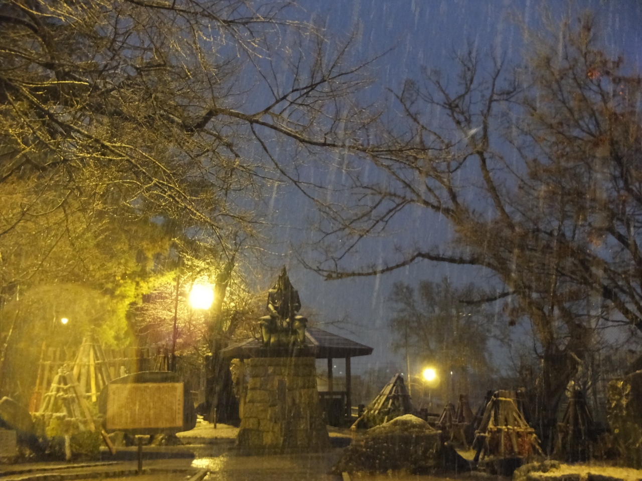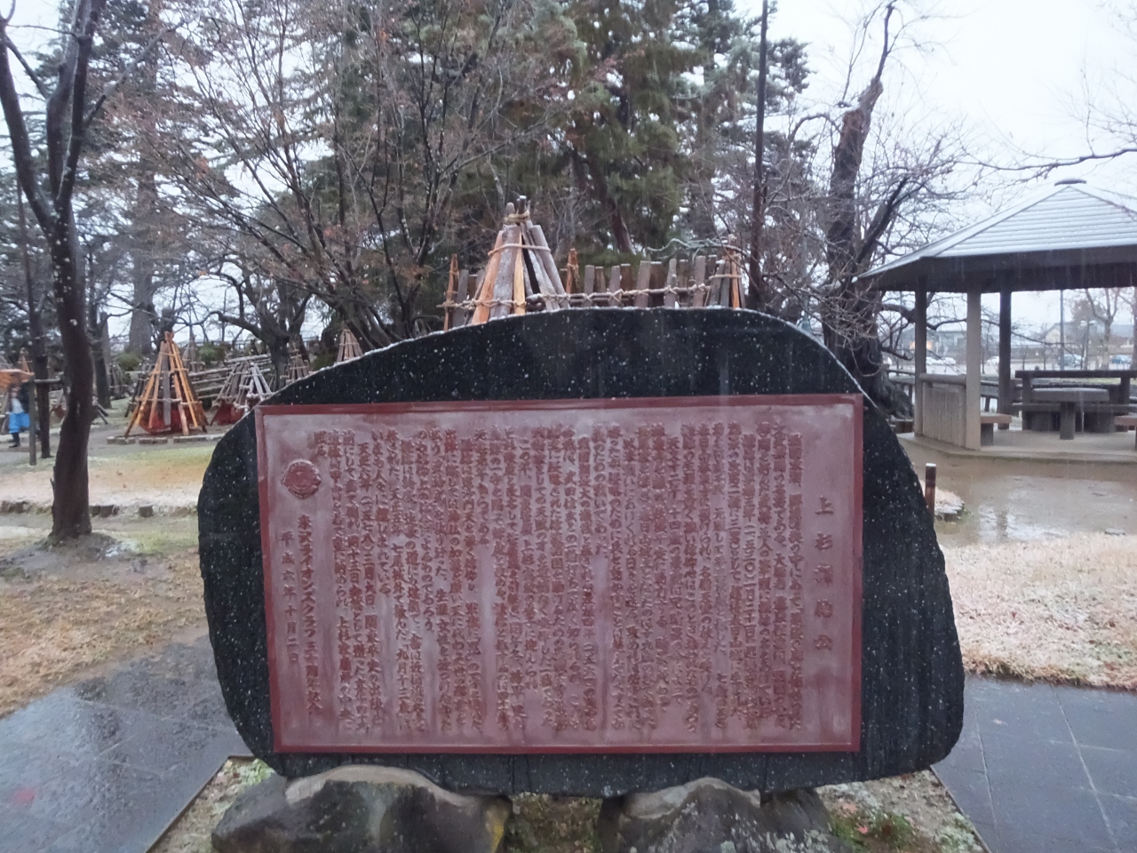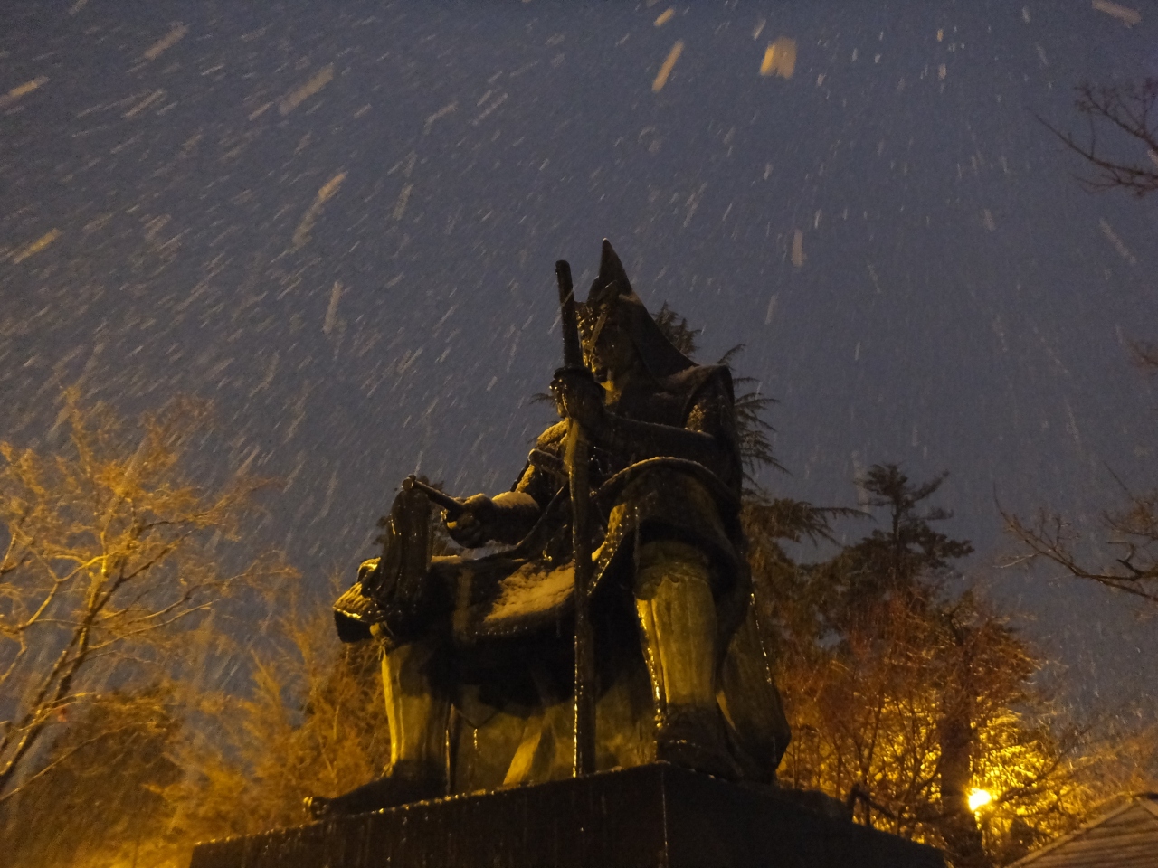 米沢城全体がそうでしょうが、桜の頃は像の付近もきれいだと思います。訪れた時は、初冬のみぞれ雪に打たれ、わびしそうに座っていました。