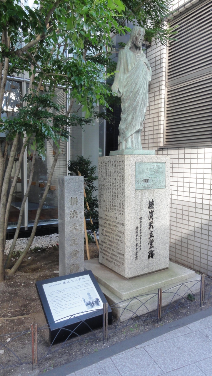 みなとみらい線の浜・中華街に近い出口の一つを上がると、すぐわきにマリア像と説明板があります。目立たないので気づかない人もあるかもしれません。開港後、1862年に居留地に住んだ外国人向けに建てられたキリスト教会の跡地です。その後、明治中ごろの1906年に、この協会は山手に移されました。2006年に100年を記念してこの地に記念碑が建てられました。