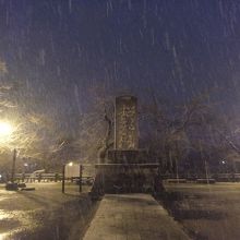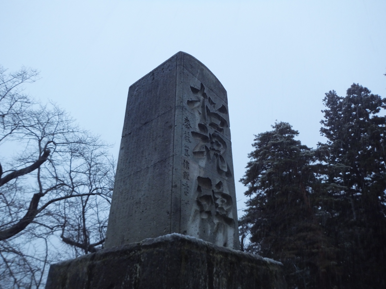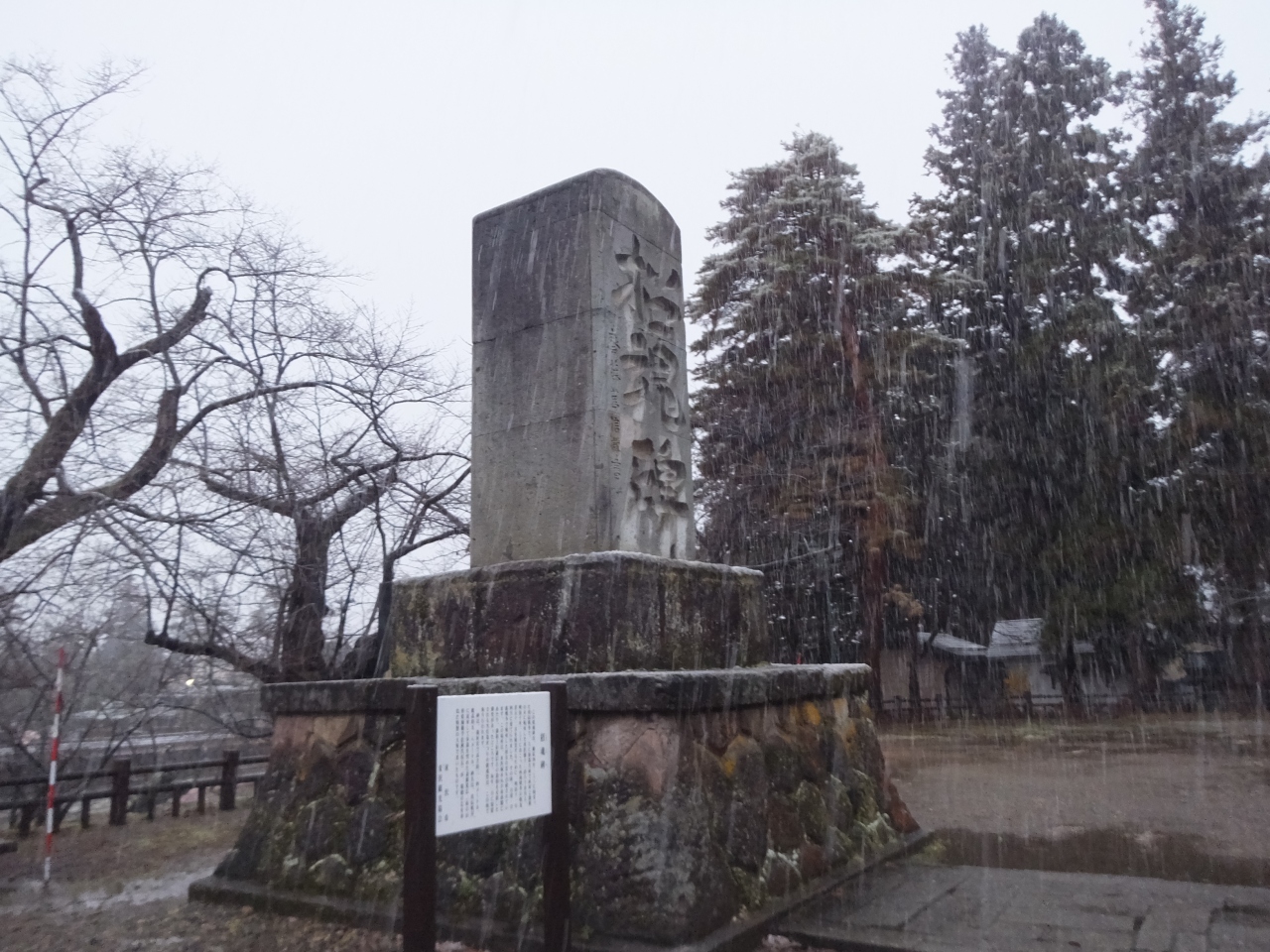 上杉神社(米沢城址)のお堀を渡ってすぐ左側の小高い広場に登ったところにありますが、もともとは上杉謙信公の祠堂があり、米沢城下でもっとも高さのある神聖な場所だったとのことです。祠堂の建物は、ここから北に1kmほど離れた長命寺の本堂に、謙信公の御遺骸は西に1kmほど離れた上杉家廟所に移されたとのことです。
