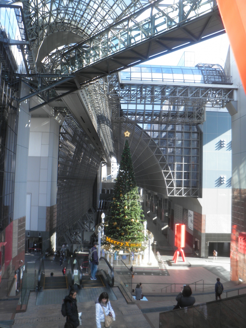 12月上旬に京都駅を訪れたら、大階段の中ほどに大きなクリスマスツリーが飾られていました。 階段に座って鑑賞する人やカメラで撮影する人が多かったです。夜になって、明かりがついたとき、エスカレーターで降りながら撮影したのですが、振動でぶれてしまいました。