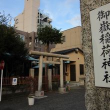 鳥居、狭いながら境内が、あれれ小社前にはフェンスが・・閉ざされている。これが都会の神社事情なのですかね。うらさびしい。
