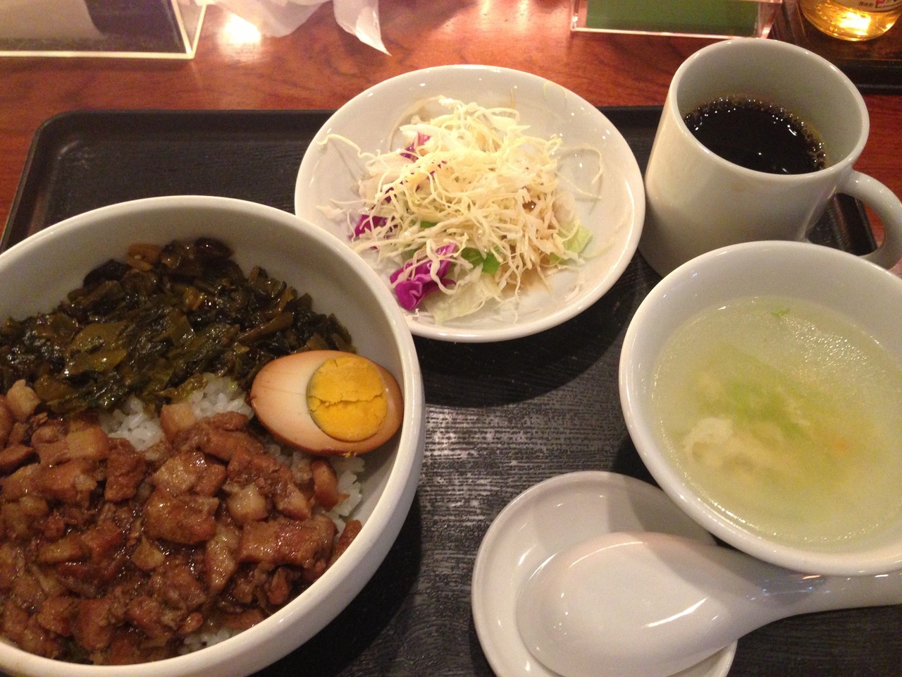 台湾丼(ルーロウファン)600円。サラダとデザート、ドリンクが取り放題です。コーヒーはインスタントではなく、ちゃんと淹れたものでしたよ