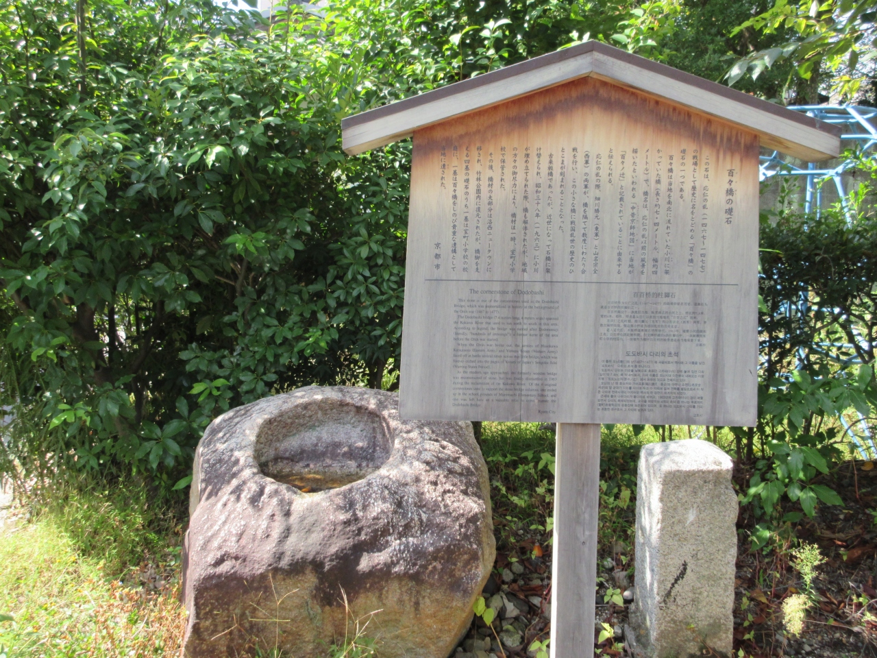 上京の本法寺に行き、小川通を南に歩いていると、東西を通る寺之内通に突き当たる辺りで、百々橋(どどばし)の礎石があります。応仁の乱(一四六七~一四七七)の戦場として歴史に名をとどめる「百々橋」の疎石の一つといいます。
