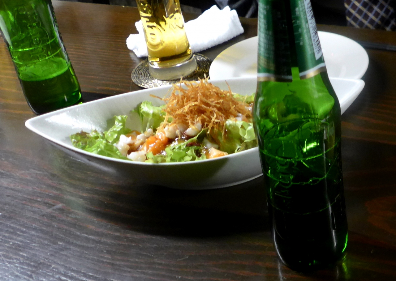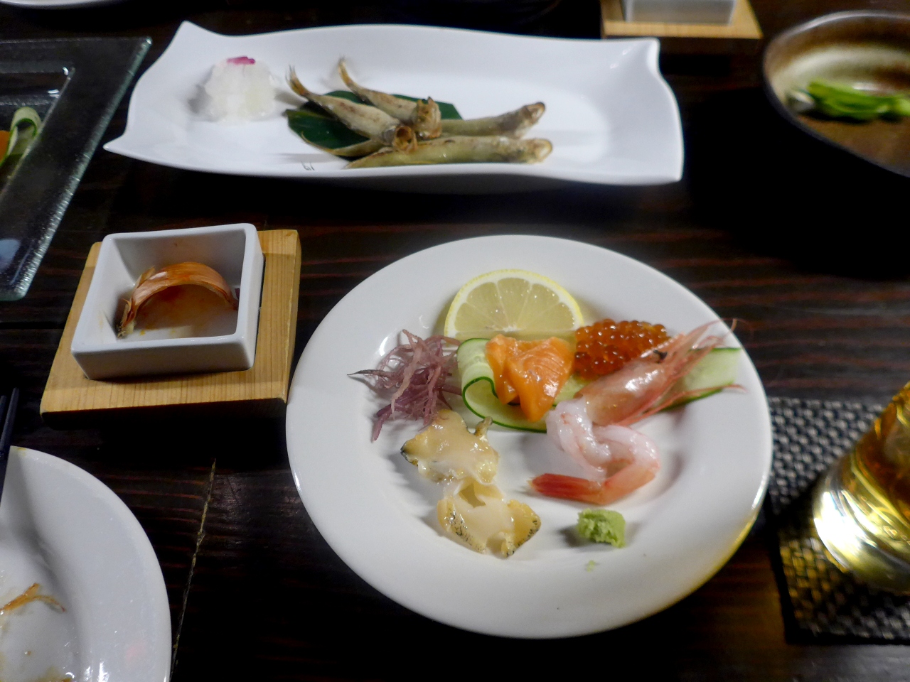 札幌駅北口からすぐの日々漁心えりも亭.ワインが似合いそうなしゃれたレストランだったが,メニューは高級居酒屋風.サントリーだったので札幌クラシックは飲めなかったが,カールズベルクビールがあり,デンマークテイストを楽しんだ.食事は刺身もししゃももまあまあ,ざるそばがとてもおいしかったのが印象的だった.入ってもい店