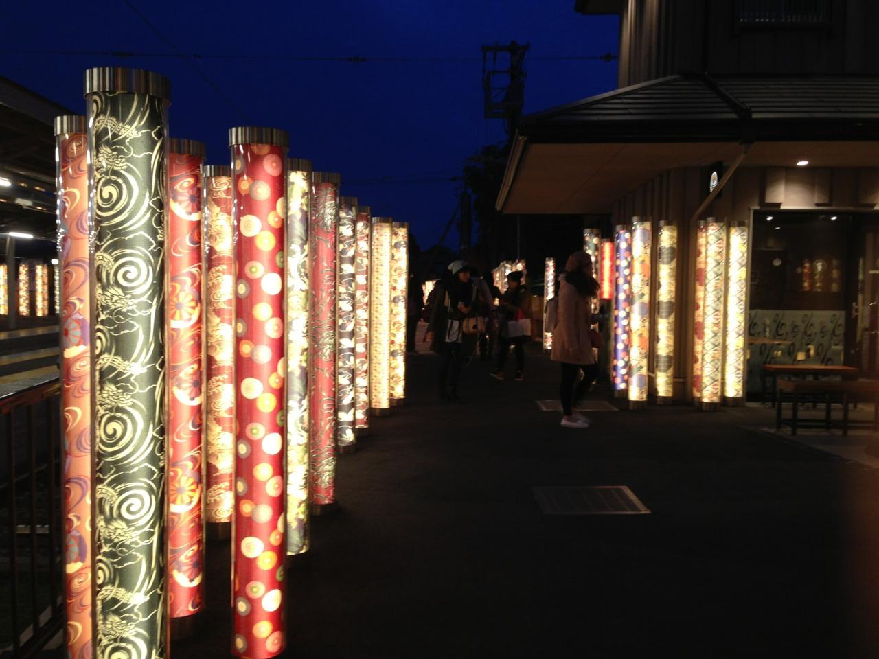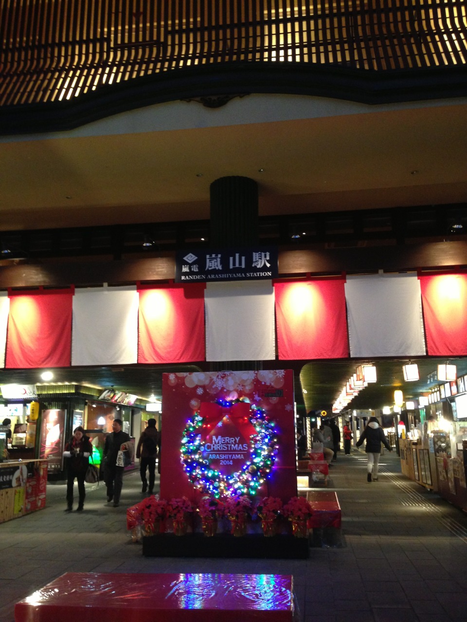 嵐電(らんでん)の到着駅、嵐山の入口です。季節ごとにいろんなイベントをやっているようですが、リニューアル後は、足湯などもできてまた新たな楽しみが増えました。今年の冬は、「西陣織」でのライトアップが、駅に到着する前から、乗客を迎えてくれます。