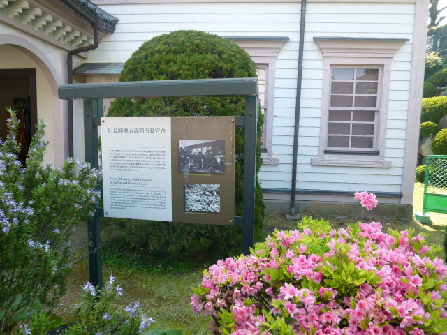 旧ウォーカー邸の向かいにある旧長崎地方裁判所長官舎があります。車寄せの玄関先には花々が植えられています。明治初期以降の伝統的な洋風デザインの要素を取り入れた、何とも言えない不思議なデザインですが色彩の調和がとても美しかったです。館内の見学の際には土足厳禁で、靴袋に入れて見学します。バリアフリーではないので、体の不自由な方は十分注意が必要です。