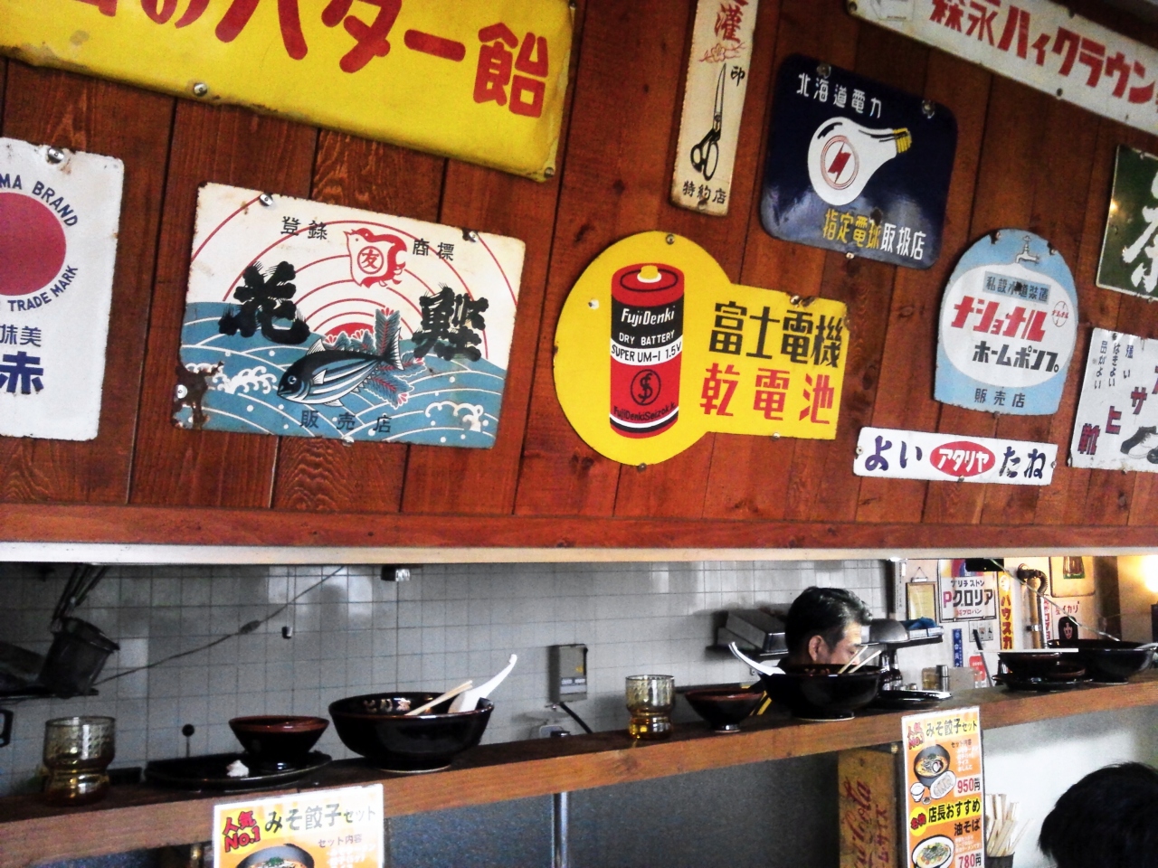 レトロな看板が沢山飾ってあるラーメン屋