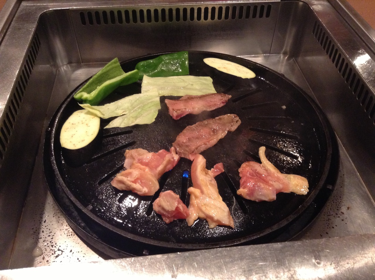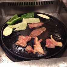 ジンギスカン風の鉄板て、カルビとマトンを注文。慣れないせいかマトンはやはりクセがありますね。