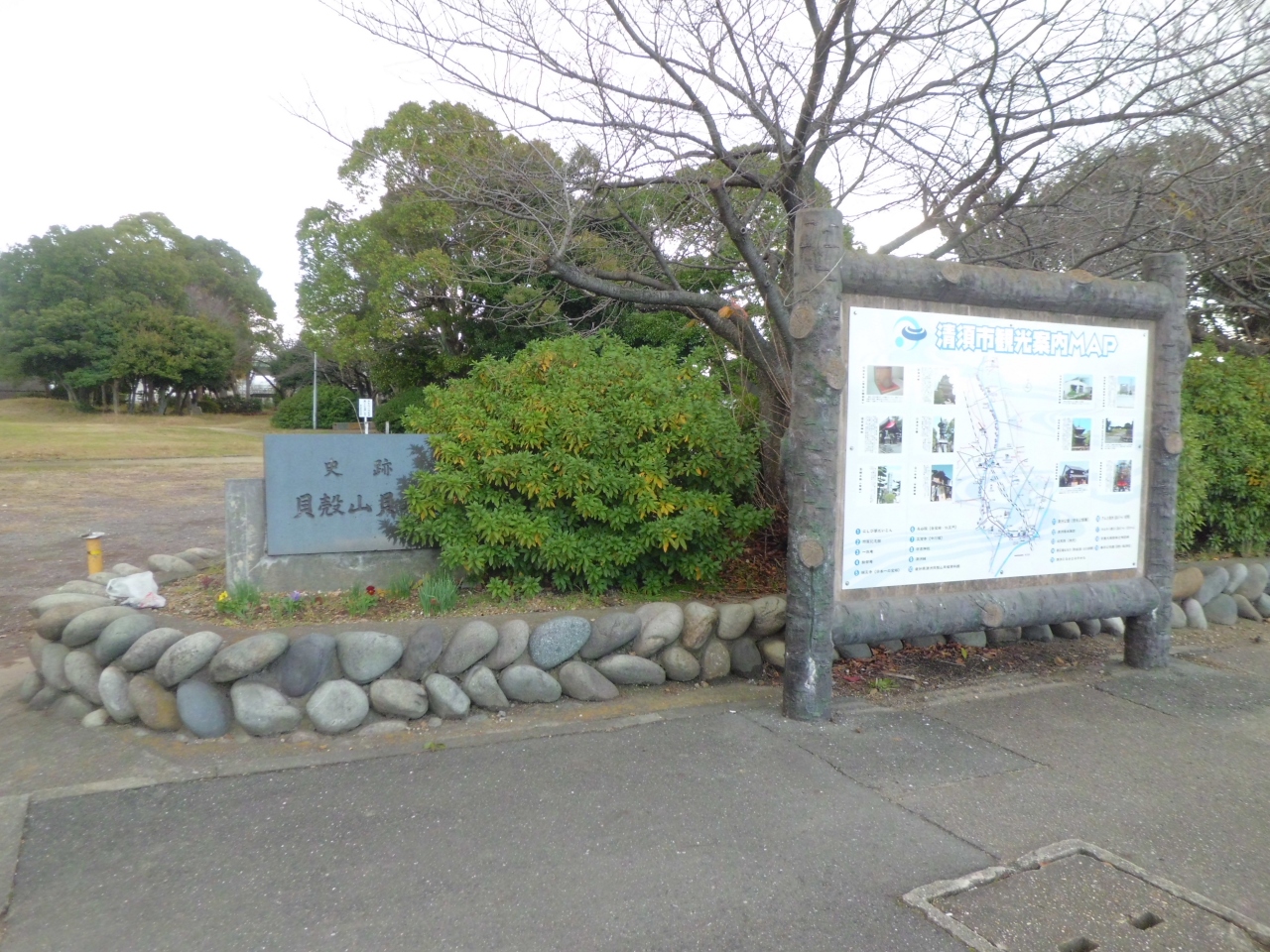 清州城や日吉神社からも近く、駐車場もあります。広場の公園の真ん中に古墳のような小さな山があり、その奥には竪穴式住居の展示があります。また、無料の資料館があり、この辺りから出土された土器などが展示されています。