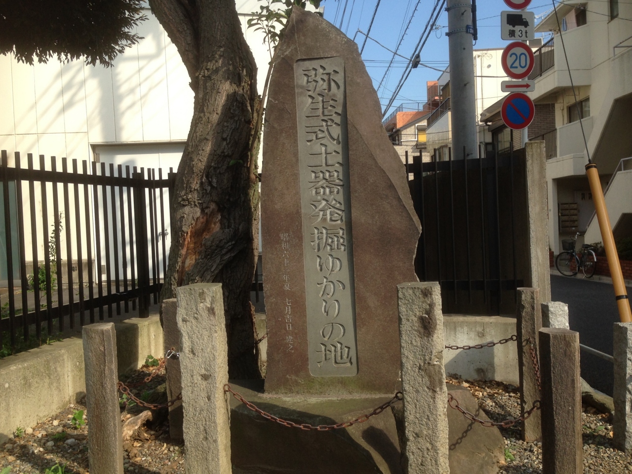 東京大学の農学部と工学部の境、弥生坂と呼ばれる坂の途中に「弥生式土器発掘ゆかりの地」の碑があります。