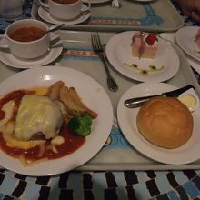 ここのレストランではハンバーグやエビフライなどのメニューがいただけます。